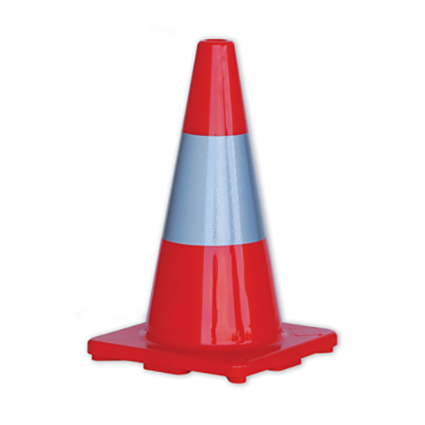 High quality orange traffic cone with reflective white band. It is made from PVC and has 150mm reflective tape.