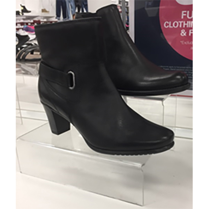 This shoe riser is made from acrylic and is ideal for displaying shoes on retail counter or shelf.