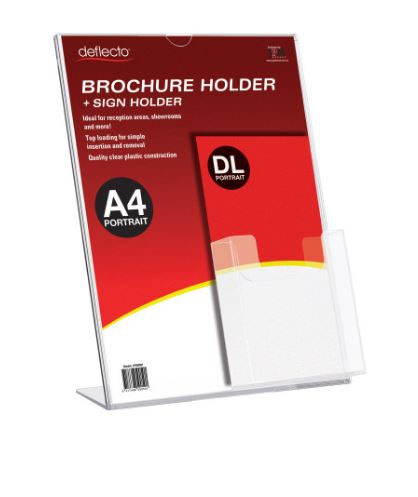 Displays A4 signage and DL size brochures simultaneously A4 Portrait sign holder with DL pocket on top. Products menus and signage from dust and spills. Quality clear plastic construction. L-shaped for single sided display. Side loading sign holder