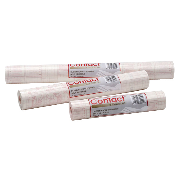 Contact is the premium standard for all book covering needs. It is made from high quality 80 micron clear gloss polypropylene with a non ageing acrylic repositionable permanent adhesive. It hasa red grid backing paper.